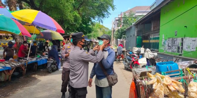 Masker dibagikan kepada sejumlah masyarakat yang berada di area pasar tradisional sambil melaksanakan patroli ciptakan situasi yang kondusif.