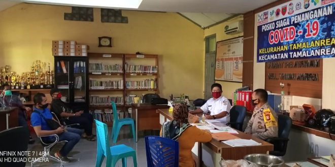 Bhabinkamtibmas Tamalanrea Polsek Tamalanrea Polrestabes Makassar, Aiptu Amiruddin melakukan koordinasi dengan Lurah Aminuddin, di Kantor Kelurahan Tamalanrea, BTP Makassar, Kamis (9/7/2020).