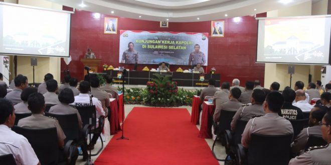 Polrestabesmakassar.com– Polda Sulsel, Kapolda Sulsel Irjen Pol Drs Umar Septono menghadiri secara langsung pengarahan Kapolri Jendral Polisi Tito Karnavian. Kegiatan tersebut di selenggarakan di Aula Anindhita Lt.3 Mapolda Sulsel pada pukul 10.30 Wita, Rabu (12/09) Siang.