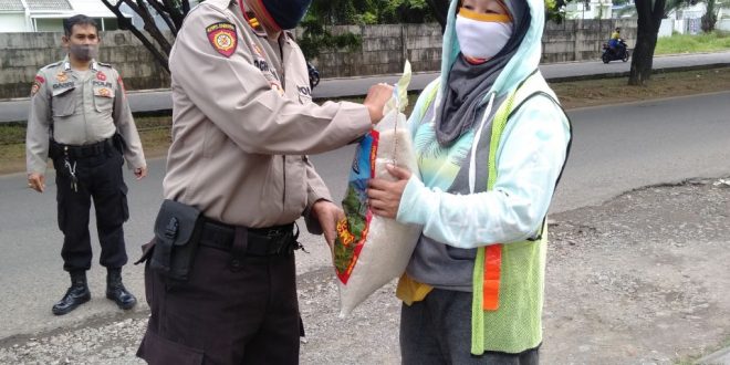 Makassar – Kanit Sabhara Polsek Tamalate Polrestabes Makassar Iptu Moch Rodja bersama anggota membagikan paket beras ke petugas kebersihan di Jln Metro Tanjung Bunga Kel Tanjung Merdeka Kec Tamalate, Selasa (16/06/2020).