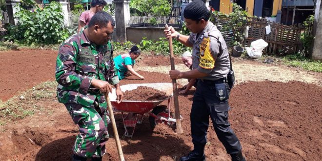 “Dengan peralatan cangkul dan gerobak kami bersama warga menggemburkan tanah yang akan dijadikan tempat persemaian bibit sayuran,” ucap Aiptu Ridwan.