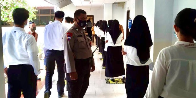 Bhabinkamtibmas Paccerakkang bersama panitia terlebih dahulu melakukan edukasi protokol kesehatan dan pemeriksaan suhu tubuh bagi para calon peserta sebelum mengikuti tes akademik.