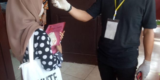 Dari pantauan kamera terlihat personil Polri yang sedang melakukan kegiatan pengamanan nampak menyemprotkan sanitiser dan pengecekan suhu tubuh kepada peserta ujian.