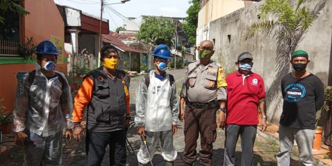 Makassar – Bhabinkamtibmas Kelurahan Wala-walaya Polsek Tallo Polrestabes Makassar bersama warga Kelurahan Wala-walaya bergotong royong melaksanakan penyemprotan cairan desinfektan di Jln Ade Irma Nasution, Kelurahan Wala-walaya Kecamatan Tallo Kota Makassar, Sabtu (20/06/2020).