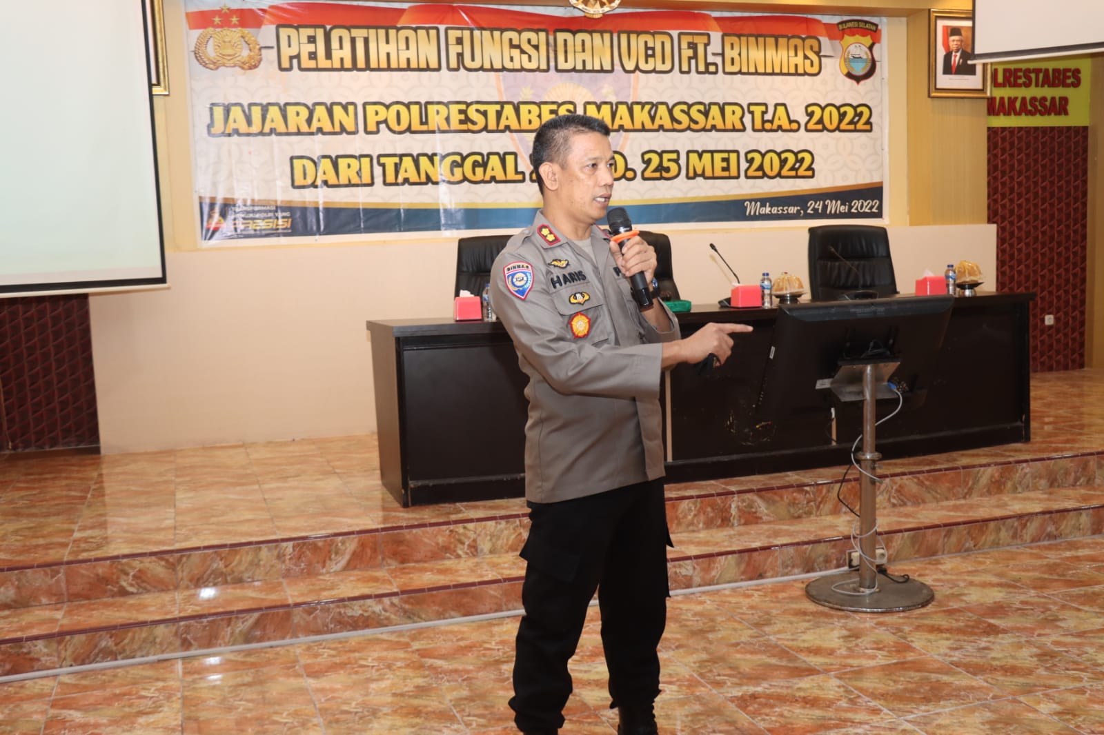 Makassar – Kabag SDM Polrestabes Makassar AKBP H. Risman Sani, S.Ag membuka pelatihan VCD Fungsi Tekhnis Kepolisian Satuan Binmas berlangsung di Aula Mappaodang Polrestabes Makassar, Jumat (27/5/2022).