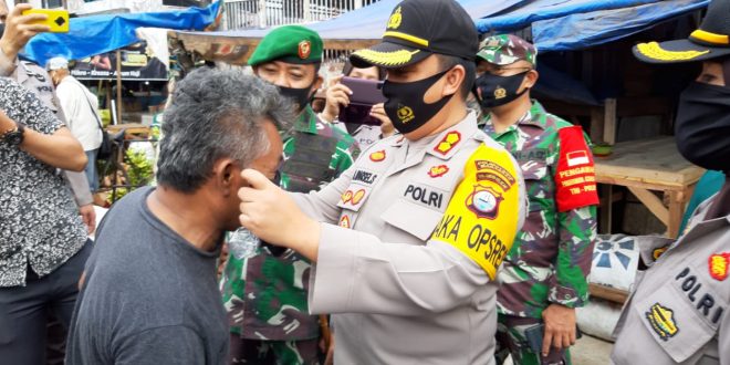 Masker yang dibagikan bukan hanya kepada pengunjung pasar yang tidak menggunkana masker tetapi juga pengguna masker yang sudah kelihatan tidak layak diberikan dan dipakaikan langsung oleh Kolonel Kav. Dwi Irbaya Sandra dan AKBP Asep Marsel Suherman.