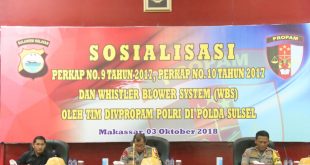 Polrestabesmakassar.com – Kapolda Sulsel Irjen Pol Drs Umar Septono memberikan sambutan sekaligus membuka kegiatan Sosialisasi Perkap 09 Tahun 2017, Perkap No. 10 Tahun 2017 dan Whistler Blower System (WBS) oleh Tim Div Propam Mabes Polri. Kegiatan tersebut di selenggarakan di Aula Anindhita Lt III Mapolda Sulsel hari Rabu (03/10) Pada pukul 08.30 Wita. Pada saat membuka kegiatan, Tampak sosok nomor …