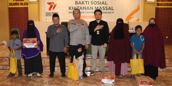 Makassar- Masih dalam suasana Hari Bhayangkara Ke 77, Polrestabes Makassar menggelar kegiatan bakti sosial Khitanan Massal dan pembagian kebutuhan bahan pokok yang dilaksanakan di Aula Mappaodang Polrestabes Makassar, Selasa (04/07/2023).