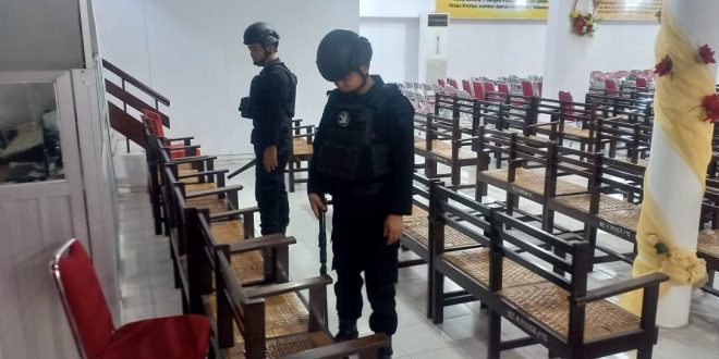 Komandan Jibom Kanit 3 Brimob Polda Sulsel Ipda Munir mengatakan kami melaksanakan pemeriksaan dan sterilisasi terhadap Gereja dengan sasaran untuk mencari dan menemukan benda berbahaya yang berkaitan dengan handak (bahan peledak) maupun Bom.