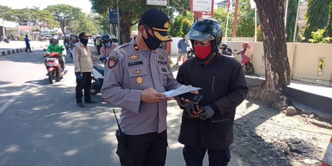 Makassar-Hari kedua pelaksanaan penerapan Perwali Nomor 36 Tahun 2020, Kapolsek Rappocini Polrestabes Makassar Kompol H.A.Ashari,SH.MH memantau Pos Check Point dan giat pemeriksaan kendaraan di Perempatan Alauddin perbatasan Makassar-Gowa. Selasa (14/07/2020)