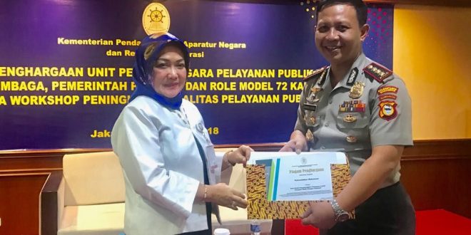 Polrestabesmakassar.com-Kementerian Pendayagunaan Aparatur Negara dan Reformasi Birokrasi (kemenPan-RB) berikan penghargaan kepada beberapa instansi pelayanan publik. Bertempat di gedung serbaguna Kantor KemenPAN -RB,Jalan Jenderal Sudirman Jakarta Selatan,Rabu (24/01/2018).