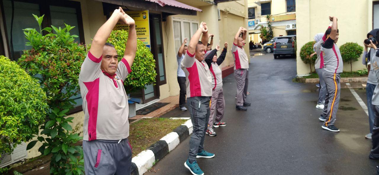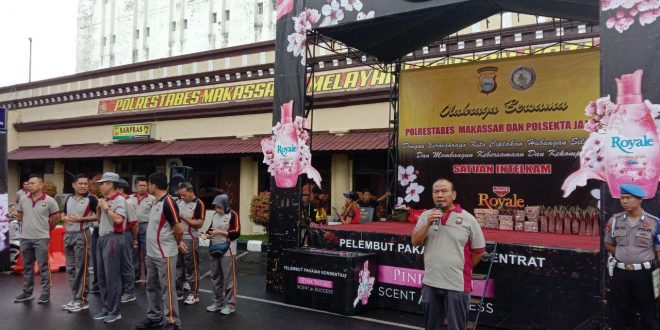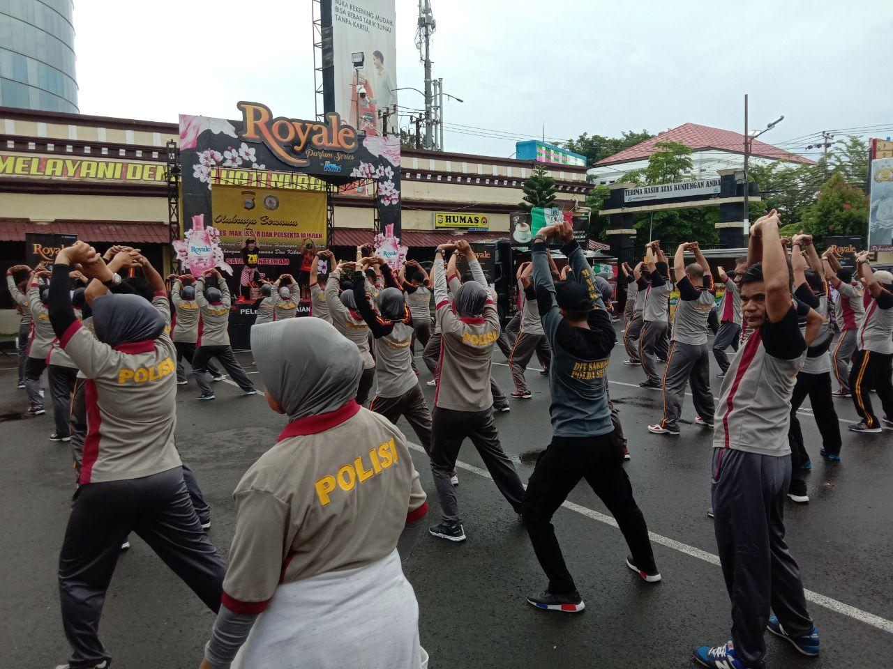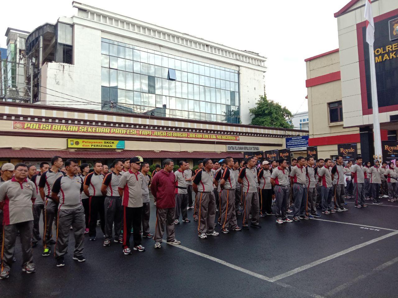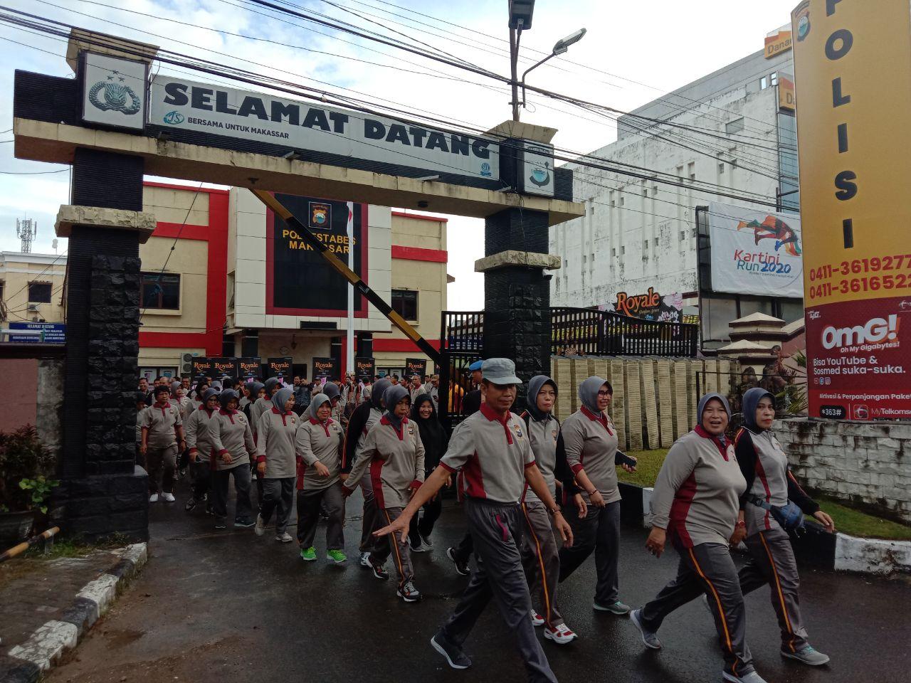 Kegiatan diawali dengan melaksanakan apel pagi setelah itu personil berjalan kaki kemudian dilanjutkan senam bersama di halaman Mako Polrestabes Makassar.