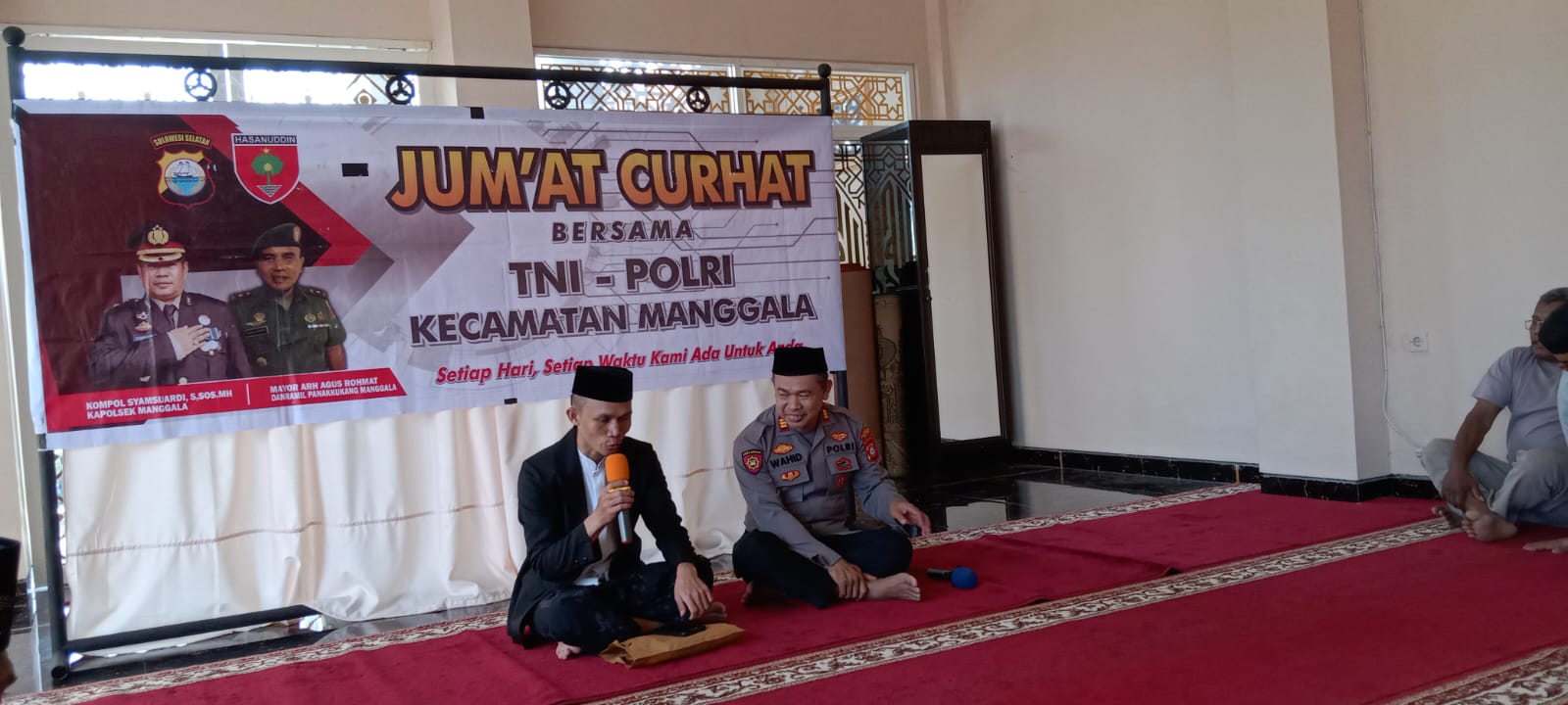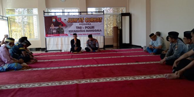 Makassar_Jajaran Polsek Manggala kembali gelar giat rutin Jumat Curhat, Silaturahmi dan mendengar langsung keluh kesah masyarakat bertempat di Masjid Al-Amaan Jln. Lasuloro Raya Kec. Manggala, Jumat (30/6/23).