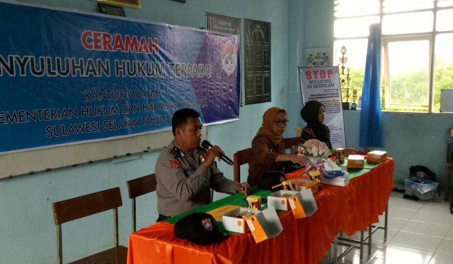 Polrestabesmakassar.com- Kanit Binmas Polsek Rappocini Polrestabes Makassar Ipda Muh Basri bersama Bhabinkamtibmas Kel. Karunrung Brigpol Kasman memberikan Penyuluhan Hukum yang diselenggarakan oleh Kantor Wilayah Kementerian Hukum dan HAM Provinsi Sulawesi Selatan. Jumat (9/3/2018) di SMA Negeri 09 Makassar Jl. Karunrung Raya Makassar.