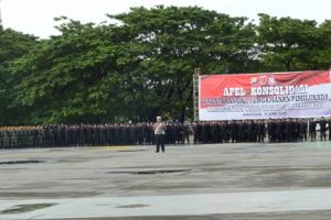 Polrestabesmakassar.com – Kapolrestabes Makassar Kombes Pol Irwan Anwar, SIK, SH, M.Hum pimpin apel Kosolidasi dalam rangka pengamanan pemilukada Walikota dan Wakil Walikota Makassar 2018, Kamis (19/4/2018).