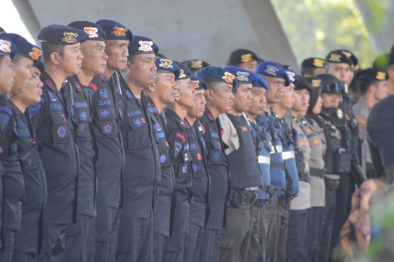 Apel pengecekan persiapan pengamanan dipimpin oleh Kapolrestabes Makassar Kombes Pol Wahyu Dwi Ariwibowo, SIK berlangsung di bawah fly over Jalan Urip Sumoharjo Makassar, Minggu (20/10/2019).
