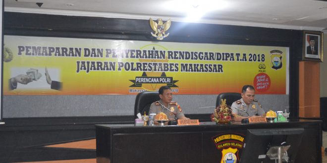 Polrestabesmakassar.com– Kepolisian Resort Kota Besar Makassar melaksanakan penyerahan Rendisgar/DIPA T.A 2018 di Aula Mappaodang Polrestabes Makassar. Kamis, 4/1/18.