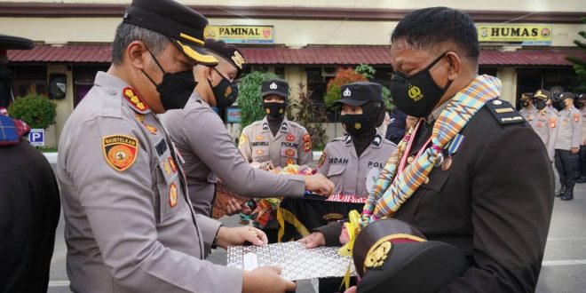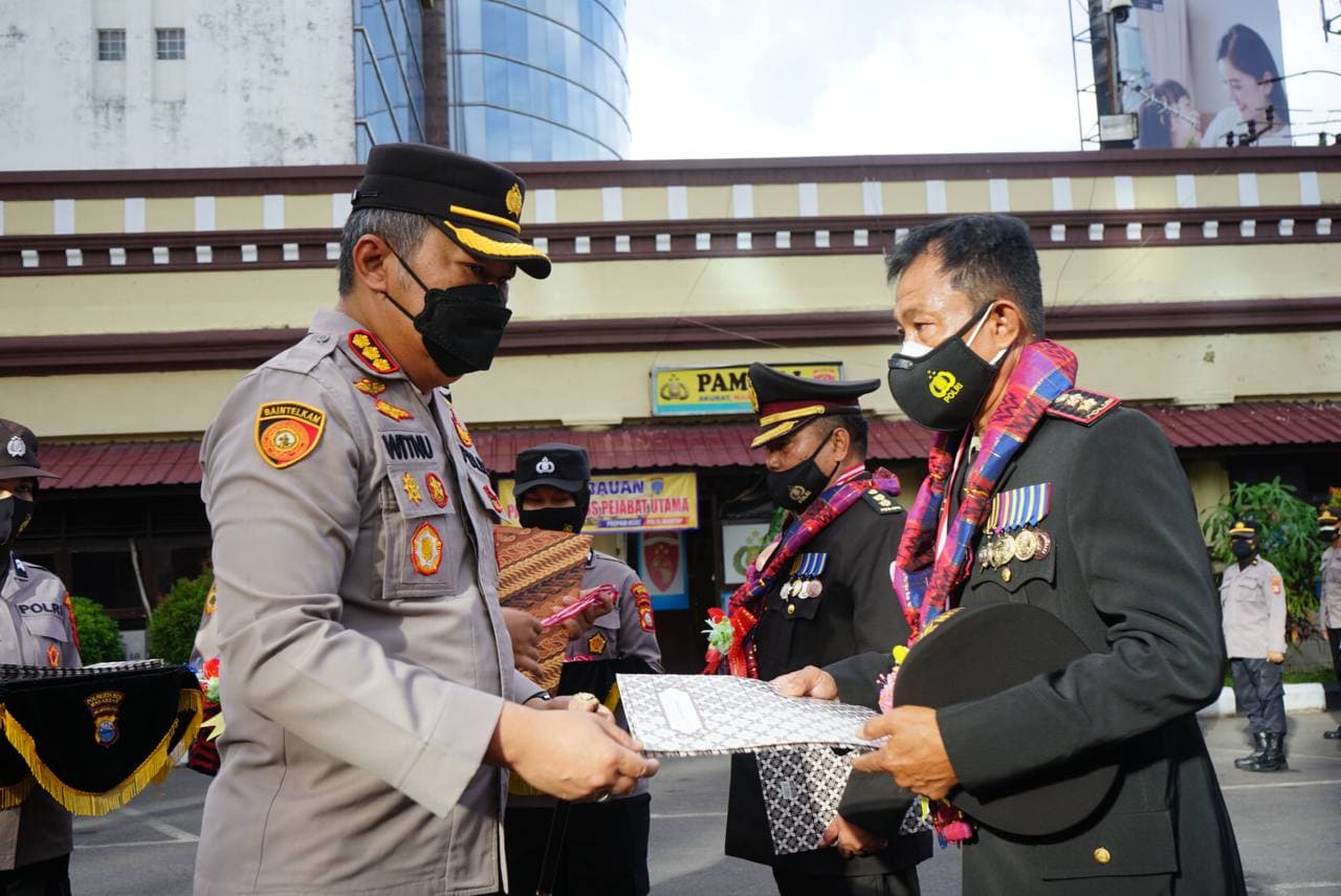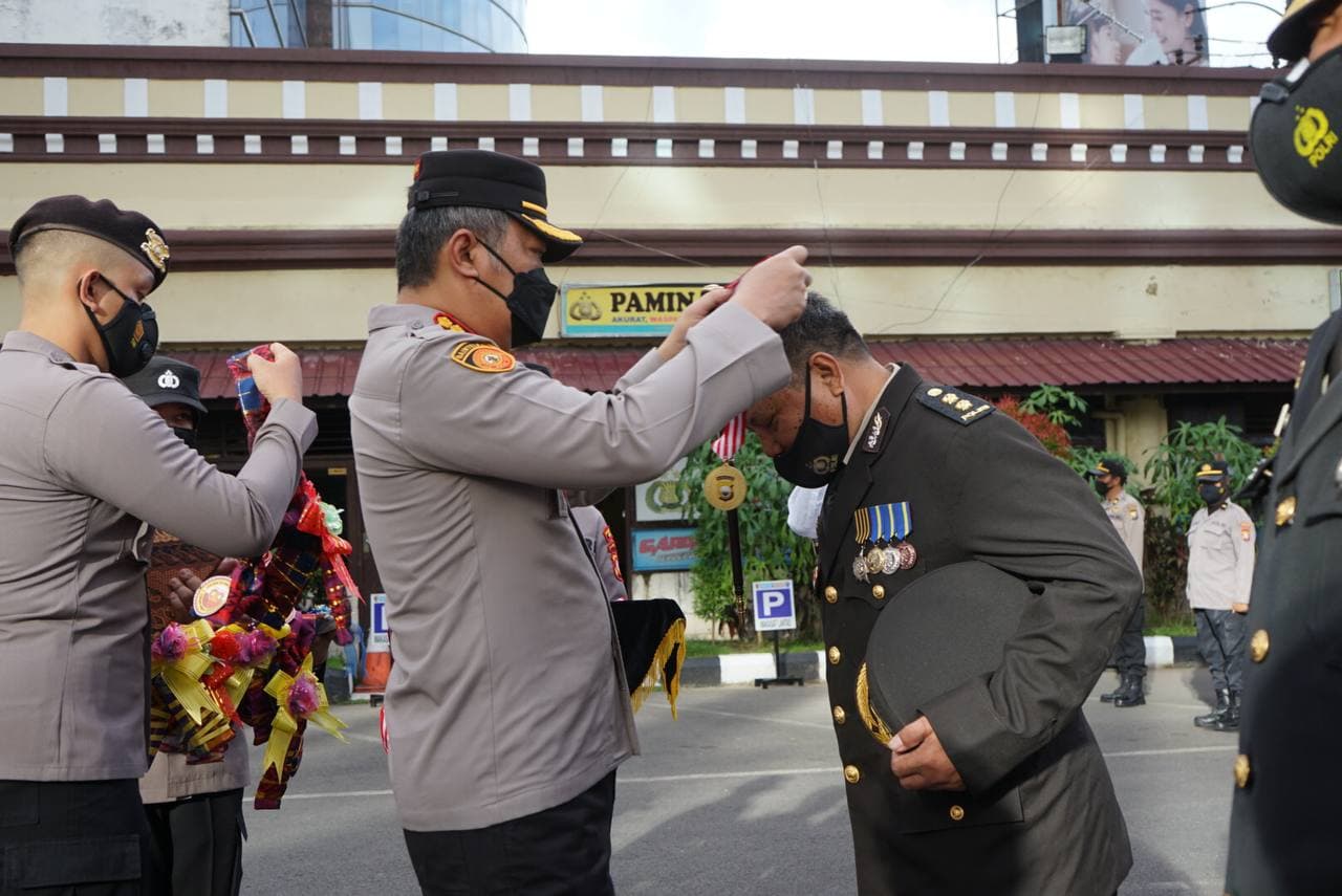 Kegiatan upacara pelepasan purna bhakti digelar di lapangan apel Polrestabes Makassar, Senin (28/06/2021) dan dihadiri oleh para PJU, Perwira dan perwakilan personil Polrestabes Makasssar.