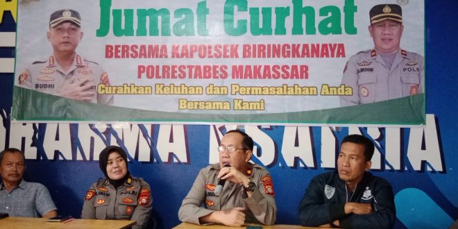 Makassar – Kapolsek Biringkanaya Polrestabes Makassar, Kompol H. Andi Alimuddin, SH menggelar kegiatan ” Jumat Curhat ” yang diadakan di Warkop Republik 44, jalan Kapasa Raya, Daya kota Makassar, Jumat, 30/12/2022.