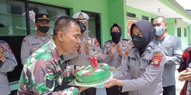 Makassar-Kapolsek Rappocini Kompol S.Syamsuddin bersama rombongan memberikan ucapan selamat Dirgahayu Ke-76 TNI Tahun 2021 kepada anggota Koramil 09 Tamalate dengan memberikan bingkisan berupa Kue Ulang Tahun yang diterima oleh Serma Rustam mewakili Danramil Tamalate Mayor Inf Samsu, di kantor Koramil Jalan Mallengkeri, Mangasa, Makassar. Selasa (05/10/2021)