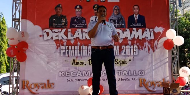 Polrestabesmakassar.com – Kapolsek Tallo Kompol Amrin hadiri kegiatan Deklarasi Damai Pemilu 2019 yang Aman Damai dan Sejuk di depan kantor Camat Tallo Jalan AR. Hakim Kelurahan Ujung Pandang Baru Kec. Tallo Kota Makassar, Sabtu pagi (3/11/2018).