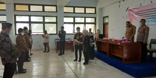 Makassar – Kapolsek Tamalanrea Polrestabes Makassar Kompol Muhammad Aris menghadiri kegiatan pelantikan dan pengambilan sumpah anggota PPS  kecamatan Tamalanrea dalam rangka pemilihan Walikota dan Wakil Walikota Makassar 2020 di aula Aptisi Jl. Perintis Kemerdekaan Makassar, Rabu (17/06/2020) sore.