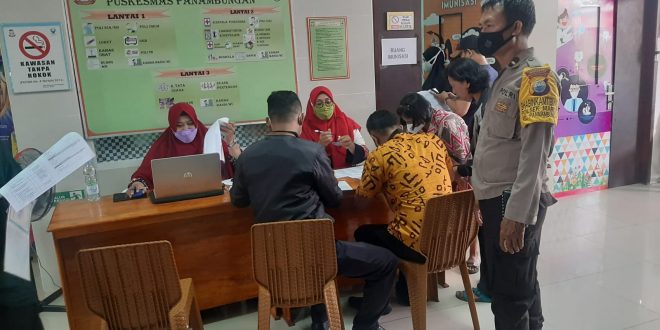 Makassar – Bhabinkamtibmas Polsek Mariso Polrestabes Makassar Aiptu Hamzah melakukan pengamanan dan monitoring pelaksanaan vaksinasi massal covid-19 di Puskesmas (PKM) Panambungan Jl .Rusunawa Baru Kota Makassar, pada Senin (7/3/22), Pagi.
