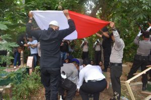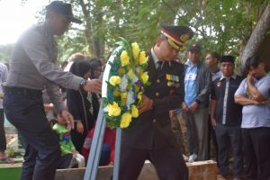 Kabag Ops juga memberikan penghormatan terakhir dengan pertama kali mengubur almarhum dan meletakkan karangan bunga di atas kuburan almarhum Bripka Mukhlis.