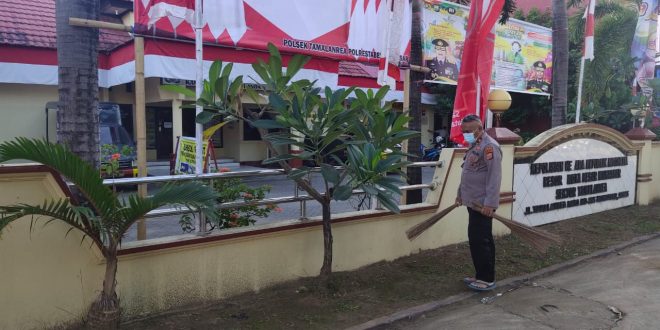 Seperti yang nampak terpantau kamera Awak Media, Kompol Muhammad Aris Polisi berpangkat melati satu yang menjabat sebagai Kapolsek Tamalanrea Polrestabes Makassar ini tak segan untuk turun langsung menyapu dan membersihkan halaman Mako Polsek Tamalanrea, Selasa (23/06/2020) pagi.