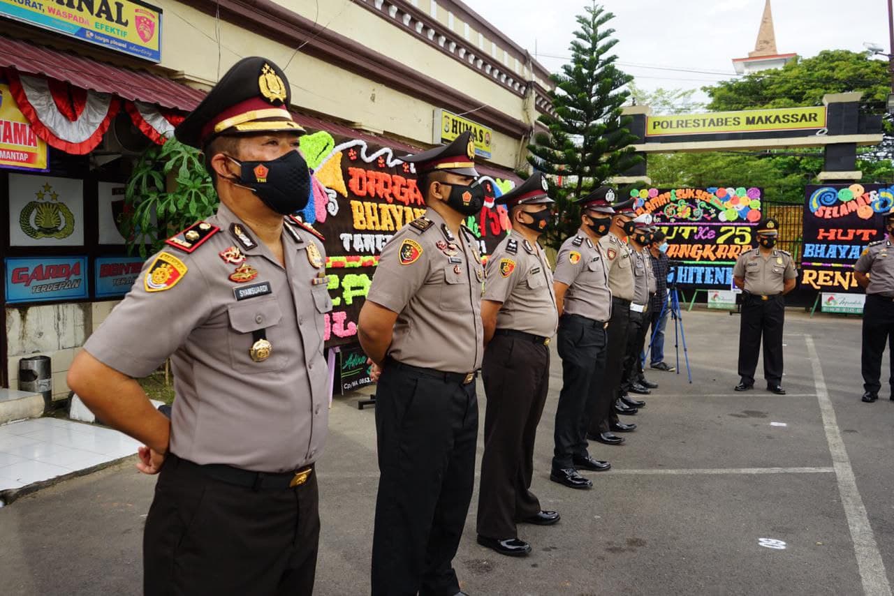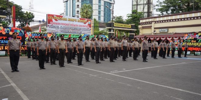 Polrestabesmakassar.com- Polrestabes Makassar menggelar Upacara kenaikan pangkat perwira dan brigadir dilapangan apel Polrestabes Makassar, Jumat (02/07/2021).