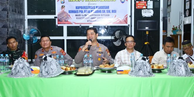 Makassar — Kapolrestabes Makassar Kombes Pol Arya Perdana, S.H., S.I.K., M.Si. menggelar kegiatan Ngopi Kamtibmas di halaman Kantor Lurah Minasa Upa, Kecamatan Rappocini, Kota Makassar, Rabu malam (08/10/2025). Kegiatan ini dihadiri sekitar 100 peserta dari unsur Forkopimcam, tokoh masyarakat, mahasiswa, serta warga Minasa Upa.
