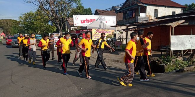 Jumat pagi (24/07/2020) dipimpin oleh Ipda Ismail (Panit 1 Intelkam) jajaran Polsek Makassar Polrestabes Makassar mengelar olahraga senam pagi dan jalan santai.