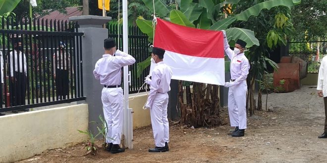 Makassar – Merayakan Peringatan Hari Ulang Tahun Republik Indonesia ke-76, personil Polsek Biringkanaya Polrestabes Makassar melaksanakan Upacara Pengibaran Bendera Merah Putih yang digelar di Pondok Pesantren Milik Ustadz Basri jalan Politeknik Kelurahan Sudiang Raya Kecamatan Biringkanaya kota Makassar, Selasa (17/8/2021).