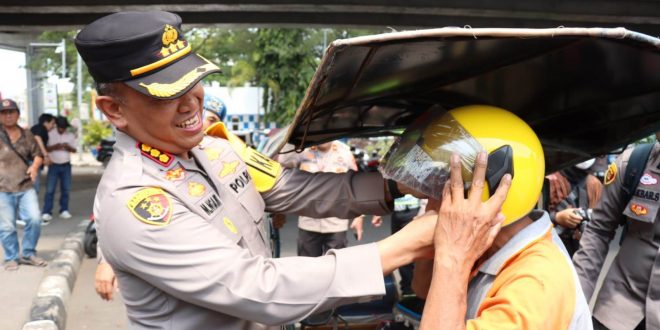 Selain menindak pengendara yang melanggar, Kapolrestabes Makassar Kombes Pol Mokhamad Ngajib bersama jajaran Polrestabes Makassar memberikan helm gratis kepada pengendara sepeda motor yang tertib berlalu lintas.