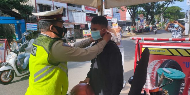 Nampak terpantau kamera awak media, Pengendara yang tidak memakai masker diberhentikan oleh anggota unit Lantas, untuk dibagikan masker dan sosialisasi protokol kesehatan untuk mencegah penyebaran covid-19.