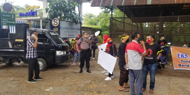 Makassar, Personil Polsek Tamalanrea Polrestabes Makassar dipimpin Wakapolsek AKP Lando, KS melaksanakan pengamanan aksi unjuk rasa dari Eks Karyawan PT Katingan Timbar Celebes (KTC) di Jalan Ir Sutami Kelurahan Parangloe, Tamalanrea Makassar, Kamis (4/6/2020).