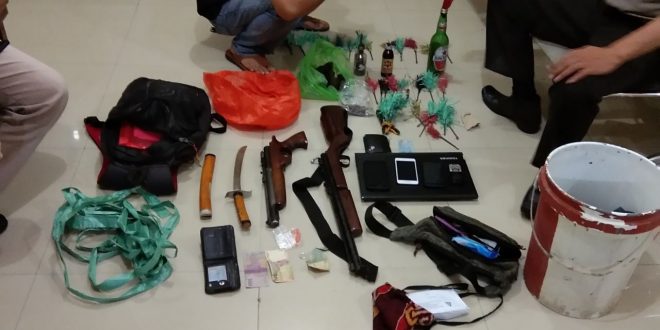 Barang bukti yang diamankan berupa Senapan angin, botol molotov, samurai, anak busur, ketapel, paku, tas pinggang, tas ransel, palu dan besi betel.