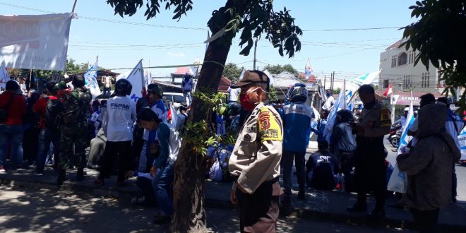 Selain mengatur lalu lintas jalan yang mengakibatkan kemacetan akibat Aksi Unjuk Rasa tersebut, juga personil melakukan pengamanan sambil menghimbau para pengunjuk rasa untuk melakukan protokol kesahatan .