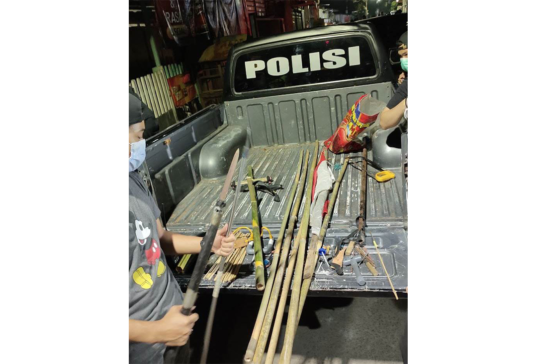 Diketahui barang bukti yang diamankan berupa, tombak/ bambu runcing, anak panah (busur), ketapel panah (busur), ketapel pelontar, rompi, potongan bambu dan besi (bahan pembuatan panah/ busur).