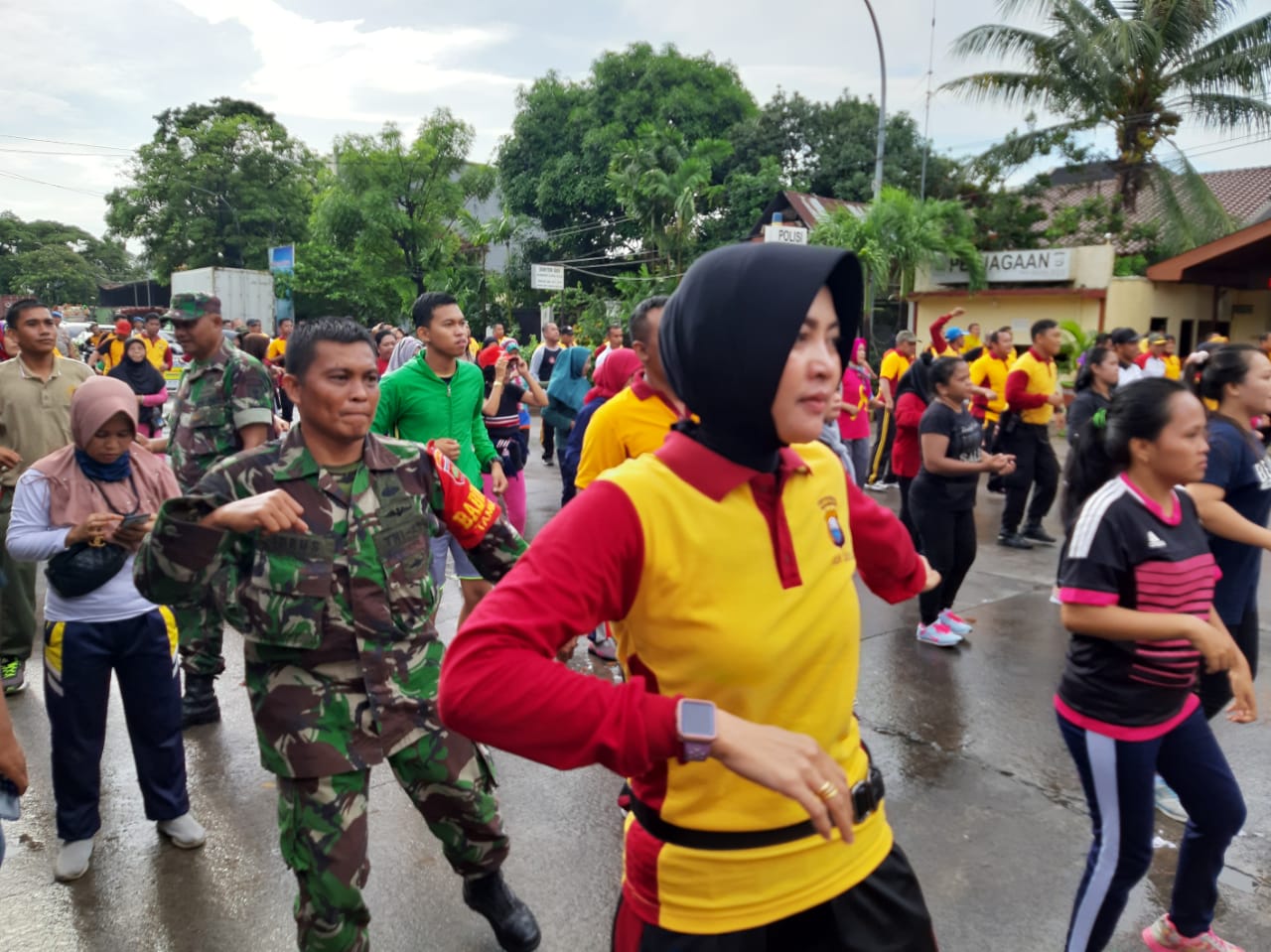 Olahraga bersama diawali dengan berjalan kaki melewati sekitar jalan di Polsek Tallo kota Makassar kemudian dilanjutkan dengan senam bersama.