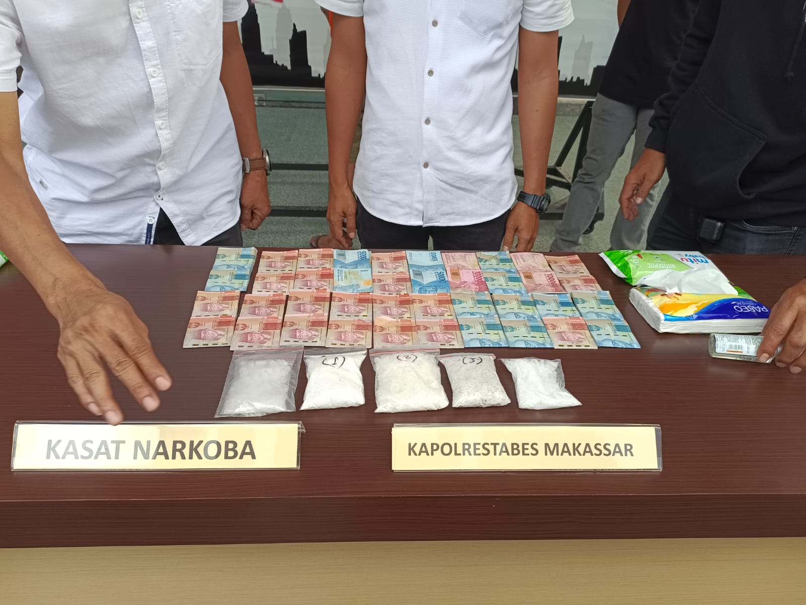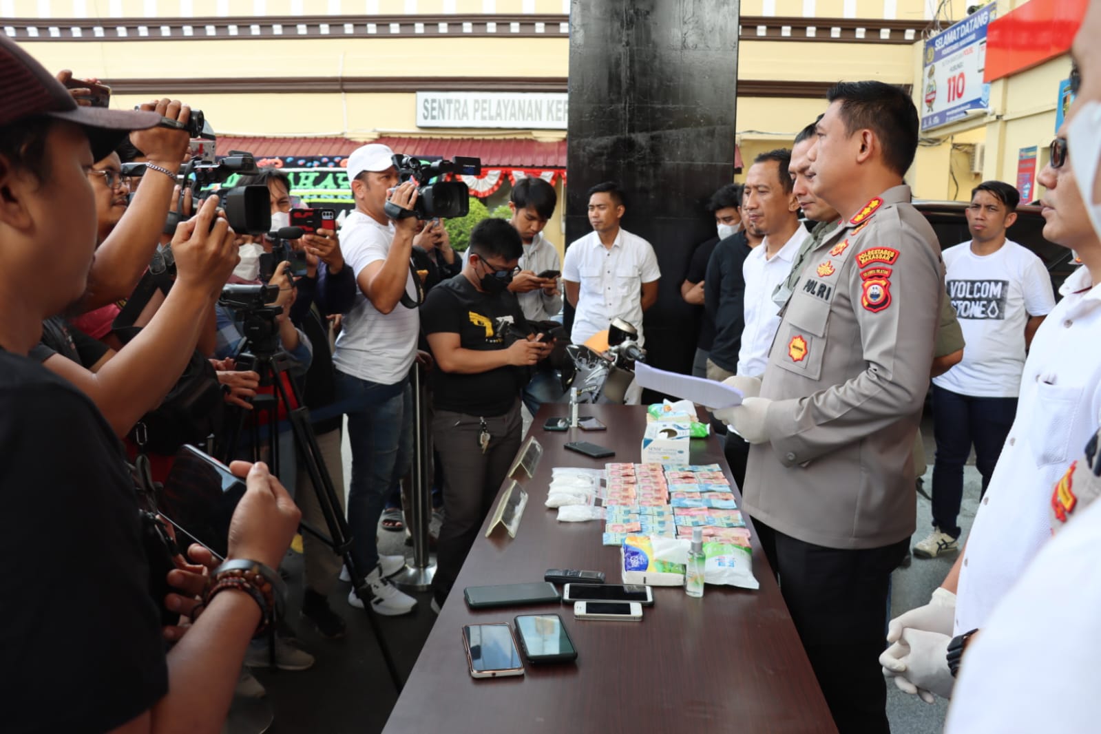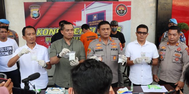 Konferensi pers dipimpin langsung Kapolrestabes Makassar Kombes Pol. Budhi Haryanto, SIK, MH didampingi Kasat Narkoba Kompol Doly Martua Tanjung, Wakasat Narkoba Kompol Ivan Wahyudi serta Kasi Humas Polrestabes Makassar AKP Lando, KS.