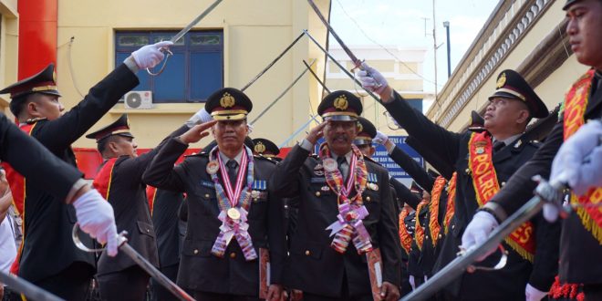 Makassar – Polrestabes Makassar gelar upacara Wisuda Purnabakti Polri dan PNS Polrestabes Makassar berlangsung di lapangan apel Polrestabes Makassar, Rabu (29/6/2022).