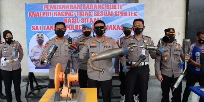 “Hari ini Polrestabes Makassar melakukan pemusnahan pelanggaran undang-undang lalu lintas nomor 22 tahun 2019 tentang kendaraan yang tidak memenuhi persyaratan teknis maupun layak jalan dalam hal ini knalpot brong,” ucap Budhi Haryanto.