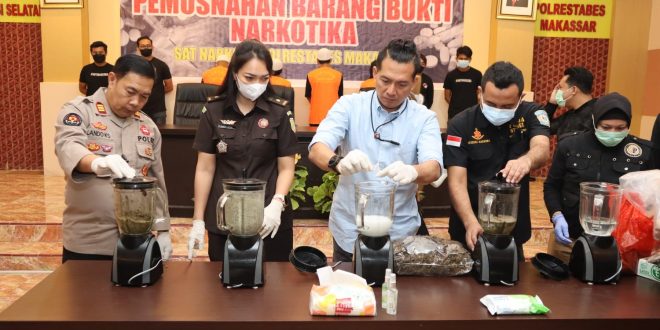 MAKASSAR – Satuan Reserse Narkoba Polrestabes Makassar memusnahkan sejumlah barang bukti narkotika berlangsung di aula Mappaodang Polrestabes Makassar, Kamis (20/10/2022).