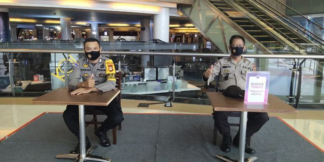 Makassar – Personil Polsek Tamalate Polrestabes Makassar dipimpin PS Kanit Binmas Ipda Tampang Salu gencar mensosialisasikan aturan protokol kesehatan di Mall Tsm Jln Metro Tanjung Bunga, Minggu (12/07/2020).