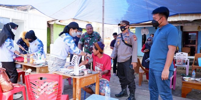 Makassar – Warga Pulau Lae-lae Kecamatan Ujung Pandang Kota Makassar, menerima vaksinasi gratis dari program ‘Kebut Vaksinasi 100%’ kolaborasi Tripika dan Tiga Pilar Kelurahan Lae Lae dengan Nakes TNI AL VI (Lantamal VI) Makassar. Sabtu (29/01/2022).