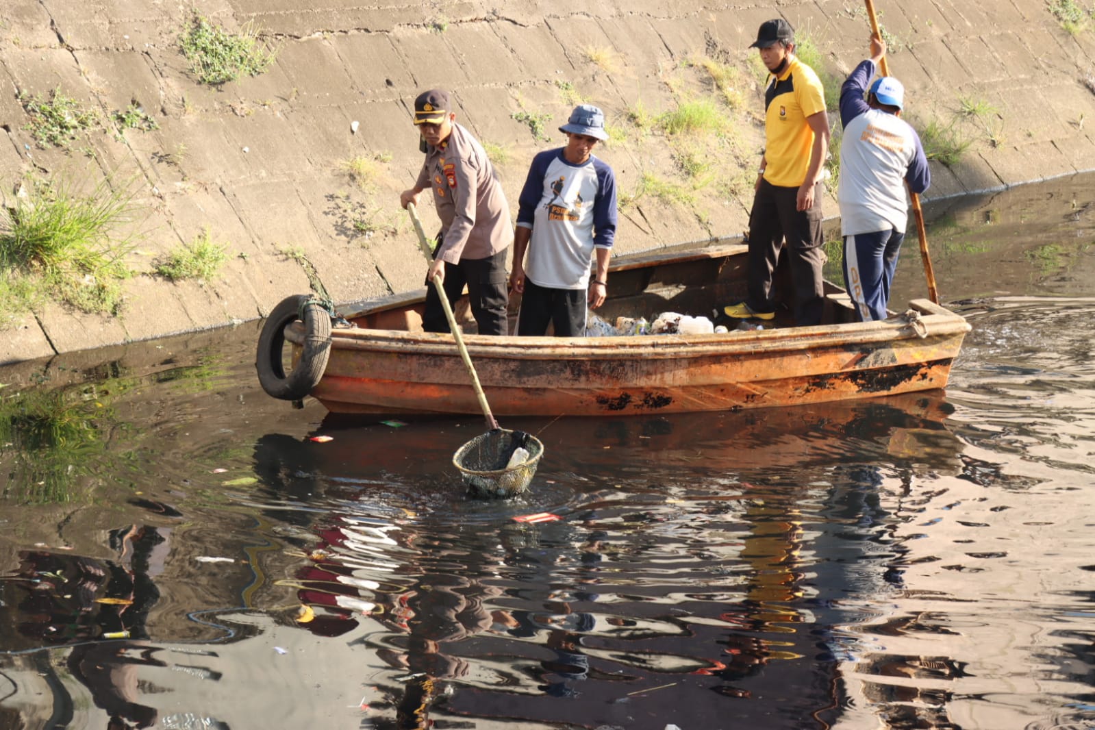 Kegiatan bakti sosial tersebut, personil jajaran Polrestabes Makassar bergotong royong bersama warga untuk membersihkan aliran kanal dari sampah.