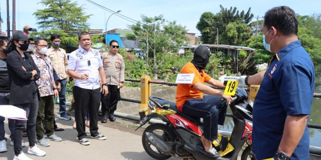 Adegan rekontruksi tersangka memperagakan menyamar sebagai pengemudi ojek online (ojol) mengeksekusi korban di atas kendaraan sepeda motor menembak korban dari arah belakang hingga korban terjatuh.
