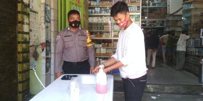 Makassar-Bhabinkamtibmas Polsek Makassar Polrestabes Makassar Bripka Asmar Hidayat, Senin pagi menyambangi beberapa tempat usaha yang berada disekitaran jalan veteran utara Kel. Lariangbangi Kec. Makassar. (10/08/2020)