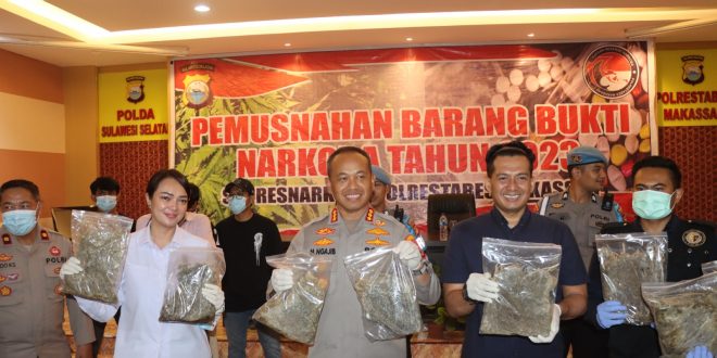 MAKASSAR – Satuan Narkoba Polrestabes Makassar melaksanakan kegiatan pemusnahan Barang Bukti Ganja seberat 3 Kilo Gram merupakan hasil tangkapan di Kompleks BTN Minasa Upa Kota Makassar pada tanggal 03 April 2023.